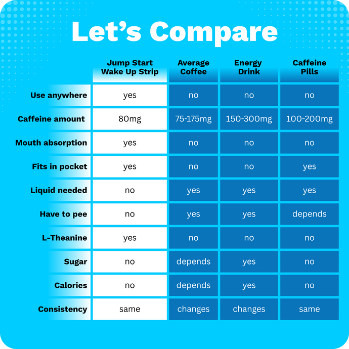 Fast dissolving oral strip with 80 mg caffeine from Arabica coffee beans, plus L-Theanine and B12 for balanced, steady energy.